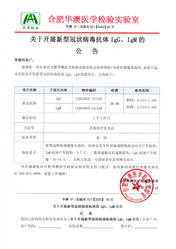 关于开展新型冠状病毒抗体IgG、IgM的公告