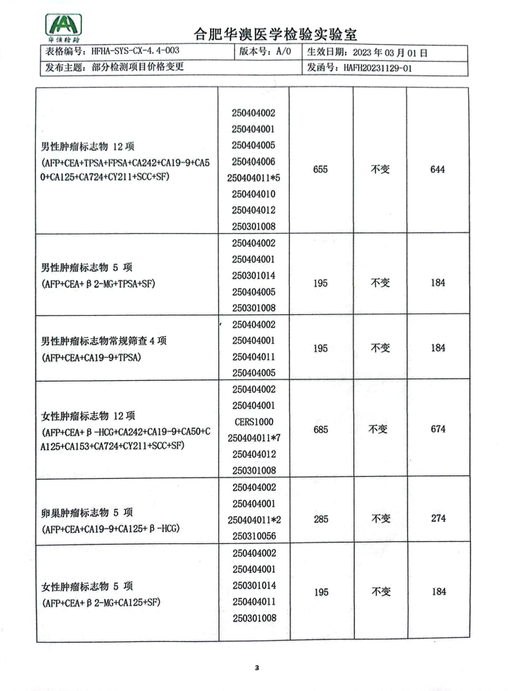 > 部分检测项目价格变更告客户通知书
