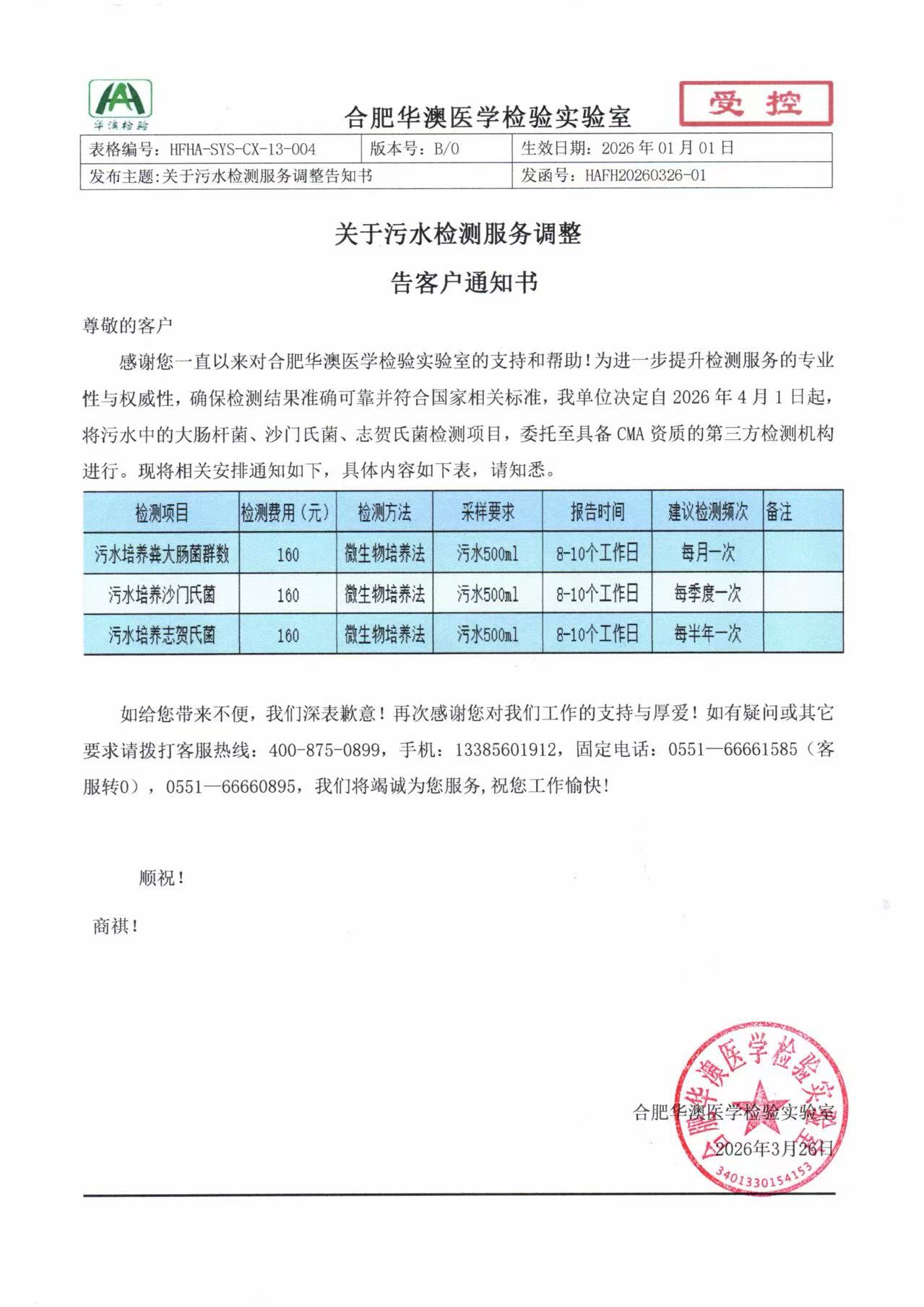 关于污水检测服务调整告客户通知书