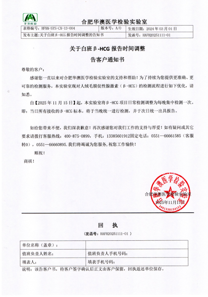 关于白班B-HCG 报告时间调整的告知书